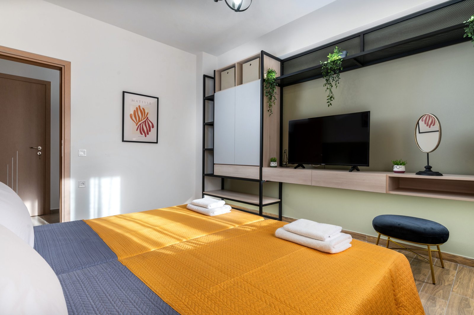 Modern bedroom in Agios Nikolaos with Smart TV, Netflix, and Starlink internet.
